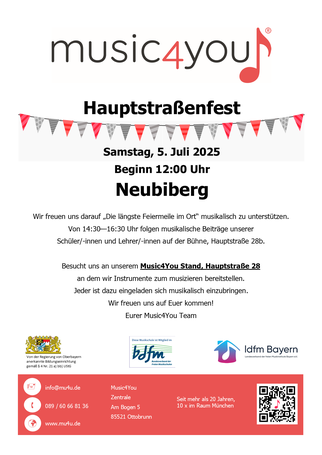 Besuchen Sie uns am Samstag, 6. Juli beim Hauptstraßenfest Neubiberg an unserem Music4You Stand, Hauptstraße 23 an dem wir zahlreiche Instrumente zum musizieren bereitstellen.